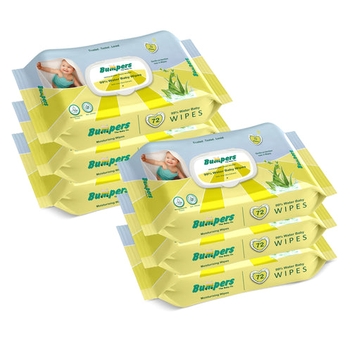 "Bumpers Moisturising 99% Water Baby Wipes with Lid, Aloe Vera & Vitamin E | Extra Thick & Moist | Alcohol & Paraben free | pH balanced & Hypoallergenic | 72 Counts/Pack (Set of 6) (432 Wipes)